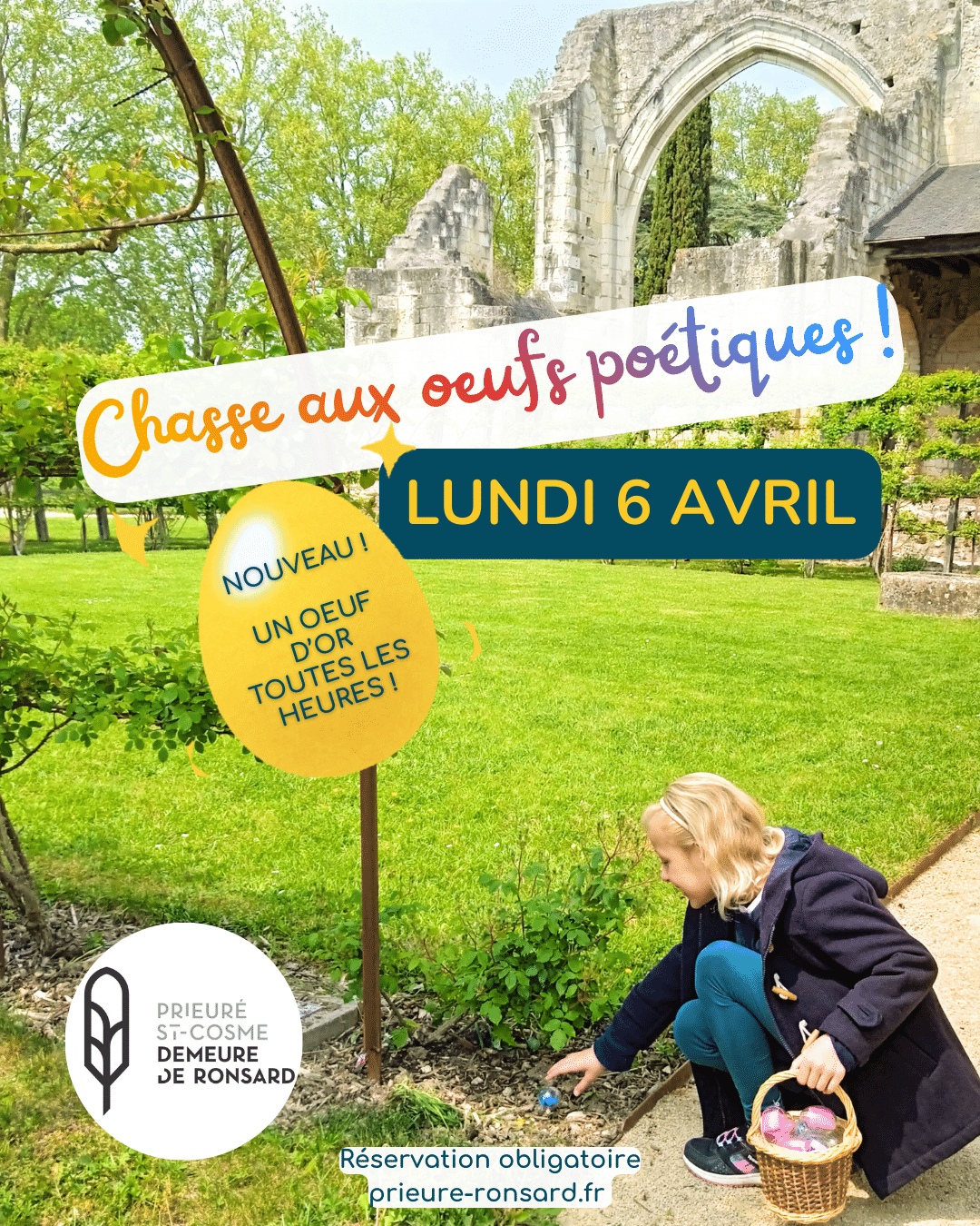Accueil Agenda a la une Chasse aux œufs poétiques Chasse aux œufs poétiques Chasse aux œufs poétiques Lundi 6 avril 2026 De 10h à 12h et de 14h à 18h Retrouvez les œufs poétiques dans les jardins pour gagner des œufs en chocolat ! BONUS ! Un œuf d’or sera caché toutes les heures pour une méga surprise ! Dans le logis du poète, vous pourrez profiter d’une pause lectures et gourmande… Tarifs : 5€ moins de 7 ans ; 7,5€ à partir de 7 ans (Droit d’entrée inclus) Adulte accompagnant : droit d’entrée du monument RESERVATION OBLIGATOIRE BILLETTERIE EN LIGNE Chasse aux œufs poétiques Jardins du prieuré 06/04/2026 à 10h à 12h - 14h à 18h 7.50€/6.50€/5€ Réserver Autres évènements Exposition Du 14/02/2026 au 31/05/2026 . Horaires d'ouverture du site CHAR’LIBERTÉ ou les « livres pauvres » dans l’épreuve – Exposition CHAR’LIBERTÉ ou les « livres pauvres » dans l’épreuve Exposition du 14 février au 31 mai 2026 Le 28e Printemps des poètes célèbre La liberté. Force vive déployée Le […] a la une 15/03/2026 . 10h30 à 17h30 Printemps des poètes – Une journée en compagnie de Paul Eluard Dans le cadre du printemps des poète 2026, venez passer une journée en compagnie de Paul Eluard au Prieuré Saint-Cosme, demeure de Ronsard Programme de la journée 11h – […] a la une 06/04/2026 . 10h à 12h - 14h à 18h Chasse aux œufs poétiques Chasse aux œufs poétiques Lundi 6 avril 2026 De 10h à 12h et de 14h à 18h Retrouvez les œufs poétiques dans les jardins pour gagner des œufs en […] Revenir aux évènements